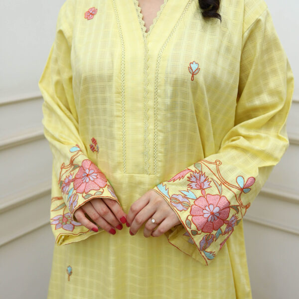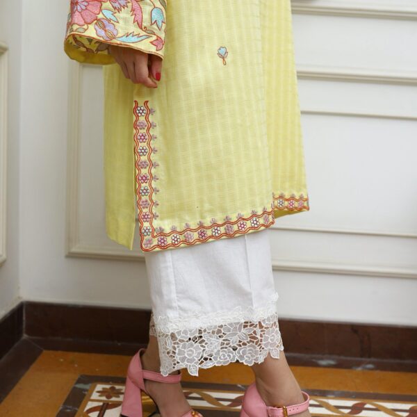| Lime serenity, Endure serenity with this beautiful yellow outfit featuring a gorgeous cotton shirt accentuated with colorful floral embroidery. It is paired with embellished white pants, lime serenity is sure to enchant at every turn. |