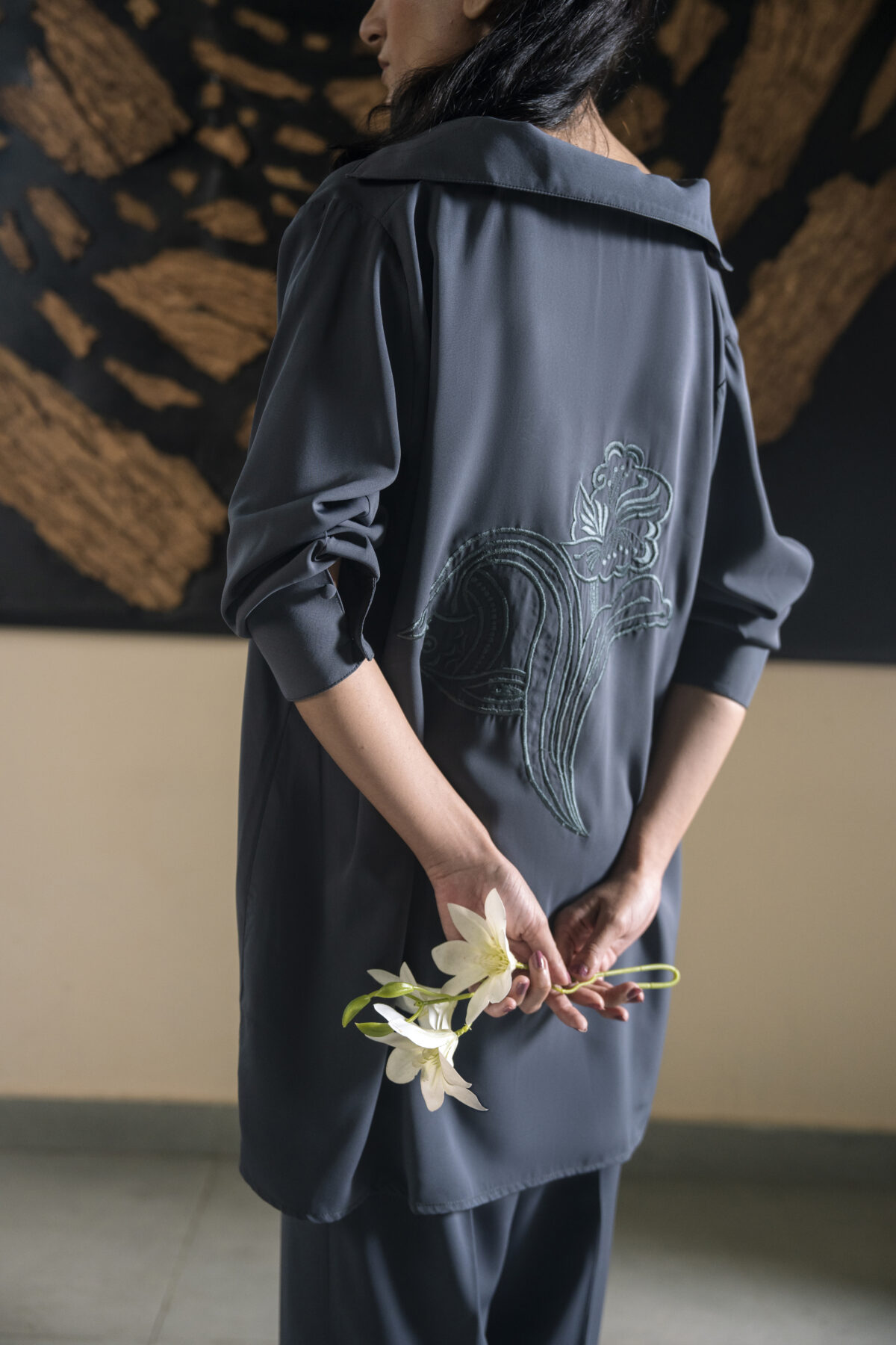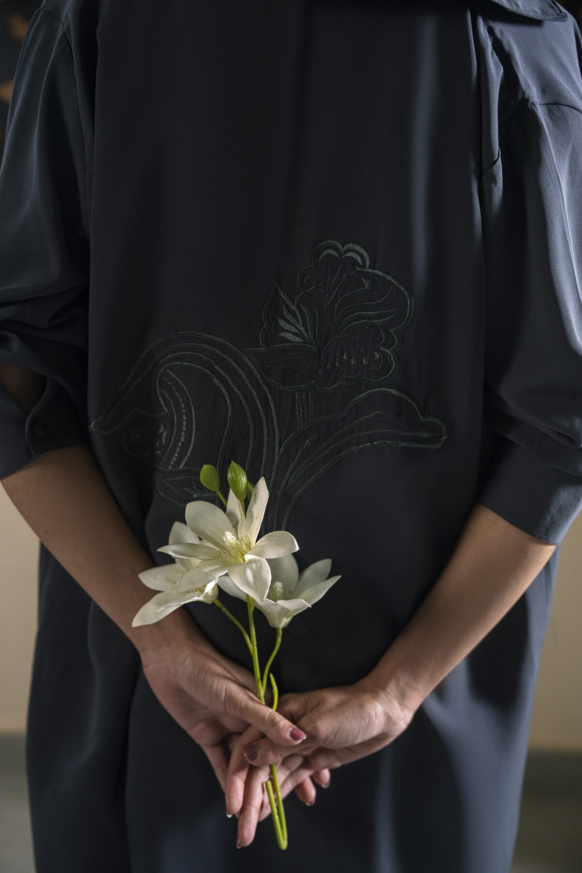 An ode to understated elegance, Noir Bloom is crafted in a soft, breathable cotton blend with a relaxed, fluid silhouette. Subtle floral embroidery graces the back, adding depth and artistry to timeless black.